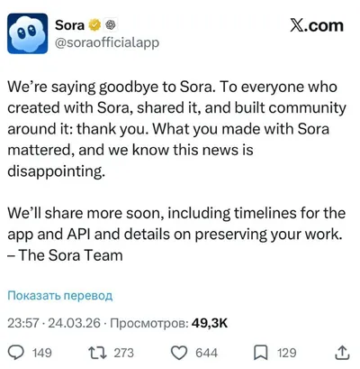 OpenAI сворачивает Sora. Модель ещё полгода назад наполнила всю ленту нейровидео. Разработчики пока не дают никаких объяснений, а просто обещают позже рассказать, как отключат приложение и API. 🧠T