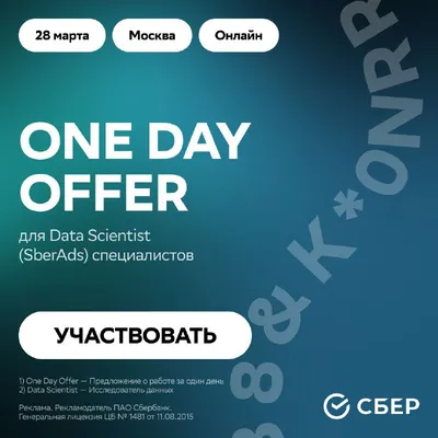 Вот это комбо: ты, команда SberAds и шанс получить приглашение в Сбер за один день! ⚡️ 28 марта Сбер устраивает One Day Offer* для Data Scientists**, готовых перевести эффективность SberAds, качество