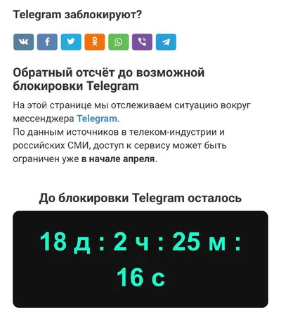 ⚠️ В сети запустили таймер до «блокировки Telegram» В интернете появился сайт с обратным отсчётом до возможной блокировки Telegram. На странице утверждается, что доступ к мессенджеру могут ограничит