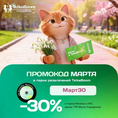 СКИДКА 30% ПО ПРОМОКОДУ МАРТА ❄️ Создаем весеннее настроение вместе с Тейкабум 🌸 Подготовили промокод со скидкой 30% на входные билеты в во все парки Teikaboom, ккроме Вегас Каширское. Промокод буд