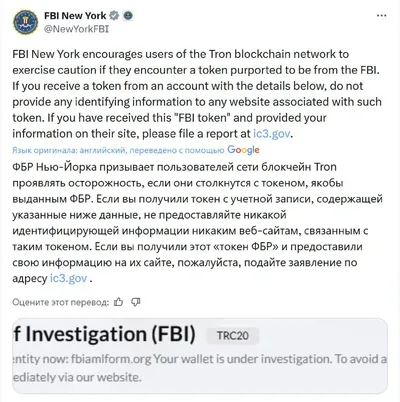 В сети TRON появился новый забавный скам. Мошенники создали токен с логотипом ФБР и рассылают пользователям письма с требованием пройти «AML-верификацию», угрожая заморозкой активов. Цель — выманить д