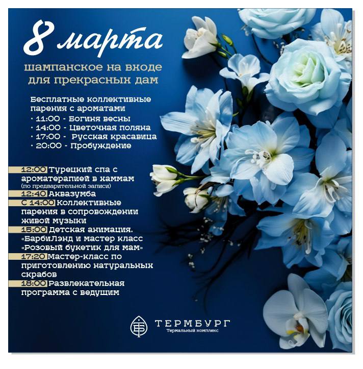 Термбург печатает🔤 Приглашаем вас отметить Международный женский день в «Термбурге»! 🌿 Для прекрасных дам — шампанское при входе и бесплатные коллективные парения с ароматами: 🌸 11:00 — Богиня в
