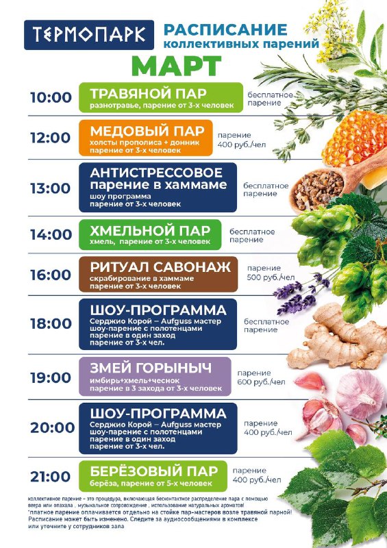 МАРТОВСКОЕ РАСПИСАНИЕ КОЛЛЕКТИВНЫХ ПАРЕНИЙ В ТЕРМОПАРК! Уже завтра встречаем новый месяц свежим паром, теплом и яркими эмоциями. ❗️ ОБРАТИТЕ ВНИМАНИЕ: 🔹Платные парения проводятся при наборе минимал