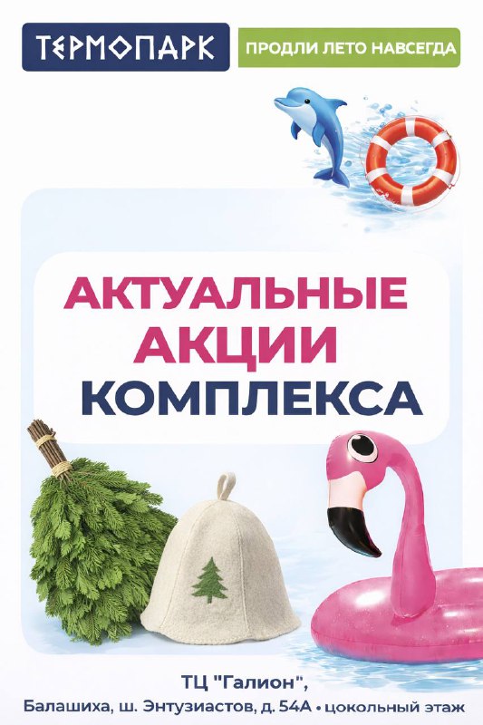 Здоровье и Фитнес🦩ТЕРМОПАРК БАЛАШИХА Официальный канал. 🎁Подписчикам дарим +1 ч. к тарифу 3,4 ч. в будни Бассейны, хаммам, русская баня, SPA, детская зона, кафе. 📍ш. Энтузиастов, 54А (8 км); 9.00-23.00 📞 +7(495)12-12-882 🌐 termpark.ru Общаемся: https://vk.ru/termpark