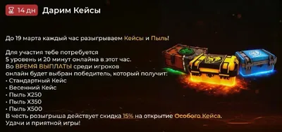 😠 Розыгрыш кейсов и пыли! ⚡️ Для участия требуется 5 уровень и 20 минут онлайна в этот час. Каждый час одному игроку дают что-то из списка: • Стандартный Кейс 🌟 • Весенний Кейс 👀 • Пыль Х250 🌟 •