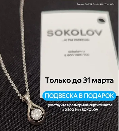 До конца марта можно забрать стильную серебряную подвеску в SOKOLOV абсолютно бесплатно 🎁 ➡️ Переходите по ссылке и забирайте штрихкод 🔗 ➡️ Показывайте его на кассе в любом магазине SOKOLOV 💞 Да