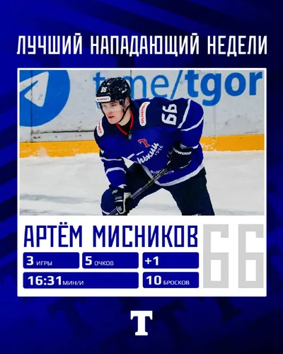 🤩 Лучшим нападающим ВХЛ по итогам предыдущей недели признан Артём Мисников! В трёх играх он набрал 5 (4+1) очков и заработал показатель полезности «+1». Кроме того, форвард оформил дубли в матчах с