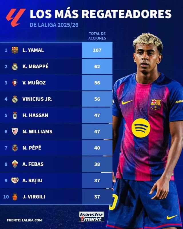 ⚡️ Игроки с наибольшим количеством успешных обводок в этом сезоне Ла Лиги ➡️@tgprimera