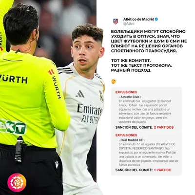 🇪🇸📲 «Атлетико» в X (Твиттер) удивились «разному подходу» к игровым моментам в Ла Лиге, приведя в пример «одинаковые формулировки» в протоколе об удалении игрока «Атлетика» Сансета и недавнем удален
