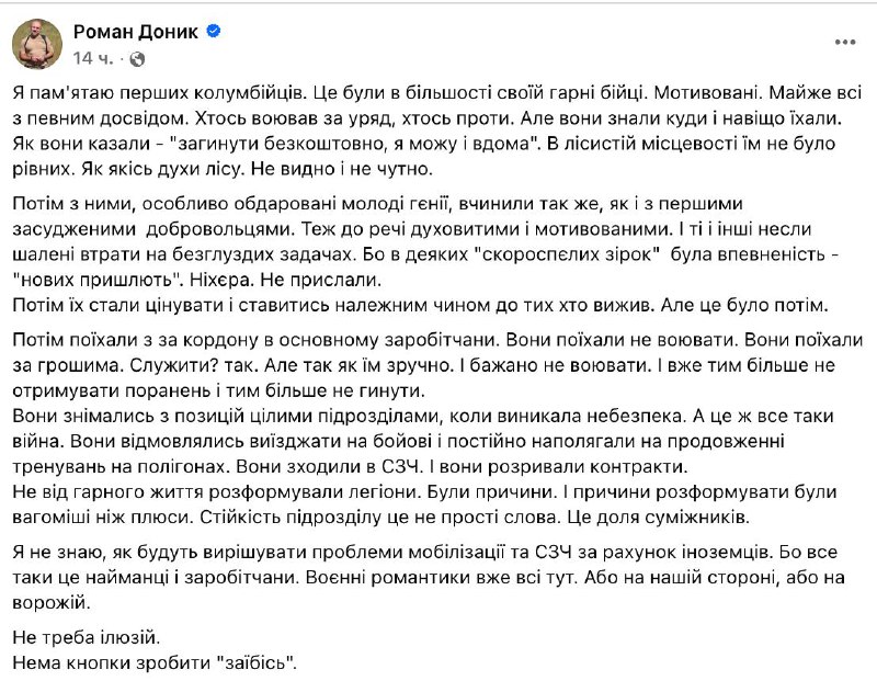 Украинский волонтер Роман Доник раскритиковал идею МОУ решать вопрос уклонистов и СЗЧ за счет иностранных наемников. Он привел в пример воюющих на стороне ВСУ колумбийцев. По его мнению, первые из н