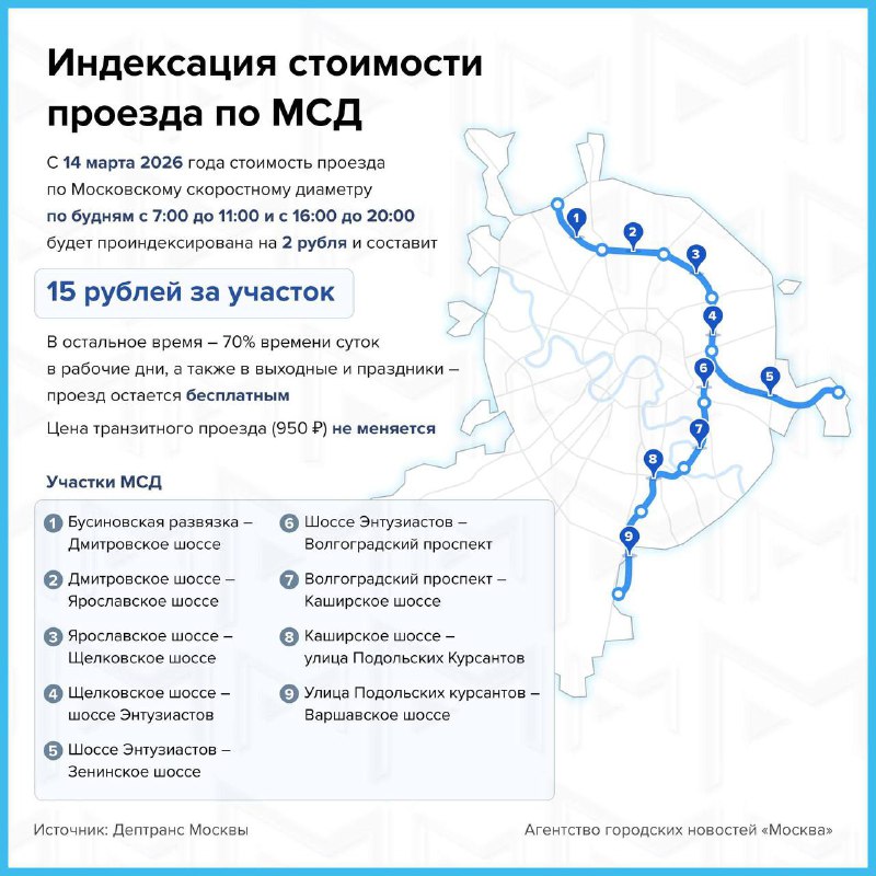 🚉 14 марта проиндексируют стоимость проезда по МСД По будням с 7:00 до 11:00 и с 16:00 до 20:00 цена увеличится на 2 рубля — проезд будет стоить 15 рублей за участок. 🔵 Mы в MАX https://max.ru/the
