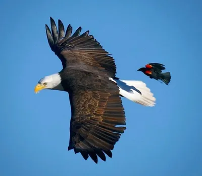 Красноплечий трупиал бросает тень на белоголового орлана во время преследования трусливого агрессора, посмевшего вторгнуться на его территорию в Скоттсдейле, штат Аризона (США). 😮 Фото: Mark Koster.