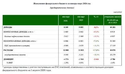 Расходы бюджета за полный 1 квартал +17% г/г, притом что расходы бюджета за январь-февраль были всего +5.8% г/г. В марте 2026 госрасходы составили 4.669 трлн рублей vs 3.179 трлн рублей в марте 2025