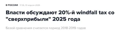 Власти обсуждают 20%-й windfall tax со «сверхприбыли» 2025 года. «Сверхприбылью» будет считаться превышение чистой прибыли 2025 года над уровнем 2018-2019 годов. В прошлый раз основными плательщиками