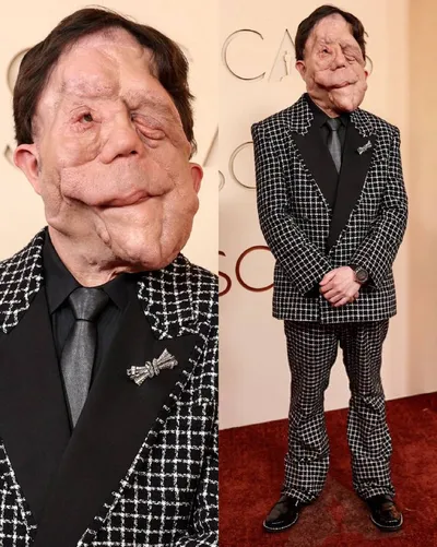 Адам Пирсон на церемонии вручения премии «Оскар». Актёр имеет заболевание нейрофиброматоз, генетическое заболевание, вызывающее рост доброкачественных опухолей вдоль нервов. ДомЗнаменитостей
