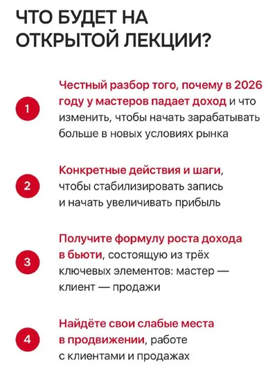 Все уже видели последние новости? 24 марта в 19:00 я проведу открытую лекцию «Формула денег в бьюти 2026» Что происходит с рынком прямо сейчас? Что реально влияет на деньги? Как привлекать клиентов