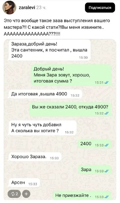 — Зараза, добрый день! Сантехник откликнулся на заказ девушки по имени Зара. Найти общий язык у них так и не вышло 🫤