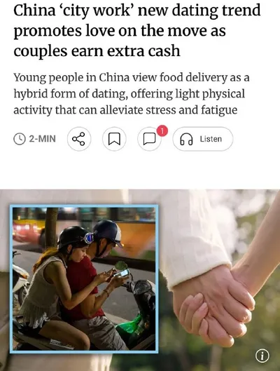 В Китае пары устраиваются работать курьерами, чтобы ходить на свидания после основной работы. Этим мувом они убивают двух зайцев — проводят время вместе и зарабатывают деньги на хотелки. Инновационны