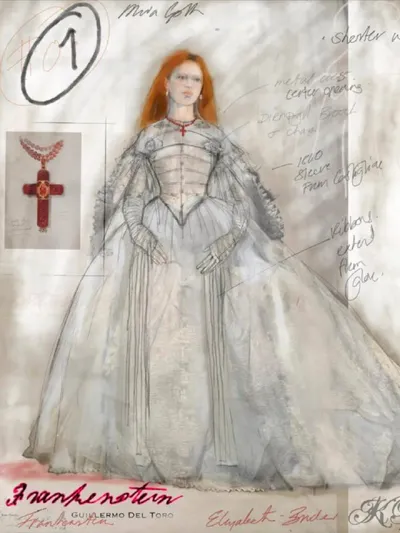 Среди всех костюмов Элизабет её свадебное платье — самое говорящее и значимое. Слои ткани цвета слоновой кости обвивают тело, как хирургические бинты, создавая параллель с Существом. Корсет вдохновл