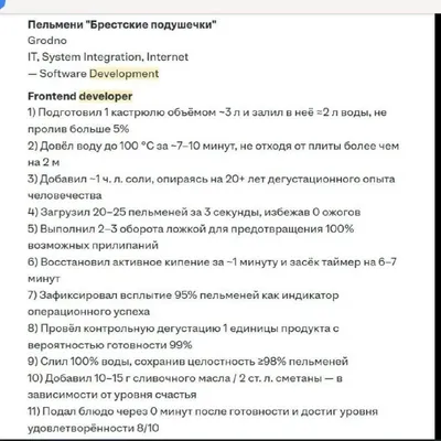 #собеседование #HR Анекдот дня. Чел написал в резюме рецепт пельменей, оптимизировал его под алгоритмические фильтры и прошел собес на фронденд девелопера. Реакция HR'a, когда на собесе он глянул рез