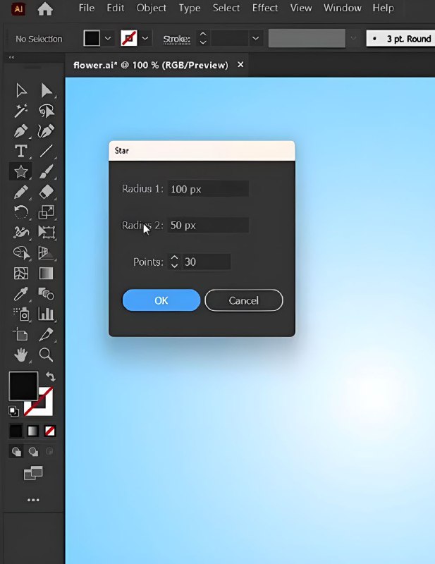 Смотри как создать цветок при помощи сложных фигур в Illustrator! 1. Форма ▸ Создаём градиентный фон или любой другой понравившийся ▸ Создаём звезду и переходим в ее настройки ▸ Ставим такие же как