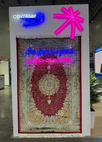 Centrum Air прилетела на MITT-2026 с ковром. Будто нам своих не хватает. Шутим, конечно. Фотозона колоритная – в самом Узбекистане ковры так популярны, что украшают даже аэропорт. Но первая мысль: