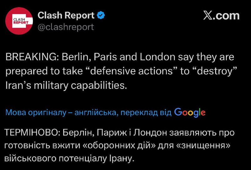 ❗️Лондон, Берлин и Париж выразили готовность нанести удары по Ирану, если атаки на их базы будут продолжаться, — СМИ ТУкраина | Подписаться