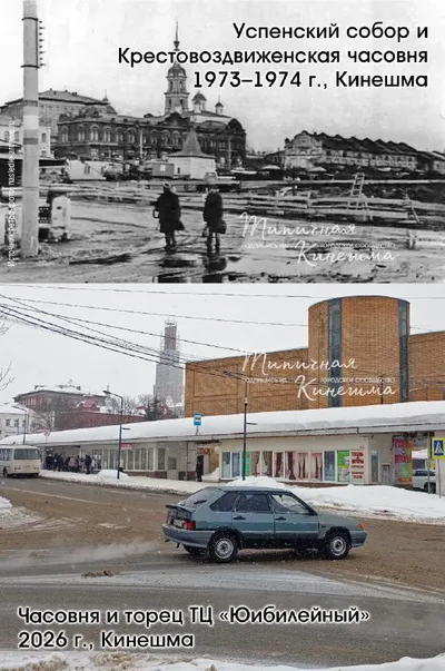 Успенский собор и Крестовоздвиженская часовня в 1973–1974 годах в Кинешме. И, Кинешма в 2026-ом, - часовня на реставрации, ТЦ «Юбилейный» (тоже на реставрации не первый год) закрывает обзор на Красные
