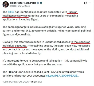 ФБР раскрыло хакеров, связанных с российской разведкой, которые взламывали аккаунты американских чиновников в мессенджерах, в том числе в Signal. Хакеры успели взломать тысячи аккаунтов, - директор ФБ