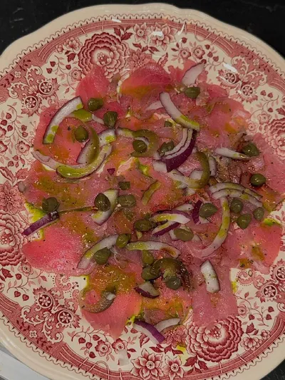 Ужин на случай, когда надо добрать белок, вы ничего не успеваете, но хочется, чтобы было вкусно: карпаччо из тунца. Тонко нарезаем тунец, накрываем пленкой, раскатывание скалкой, чтобы получилось еще