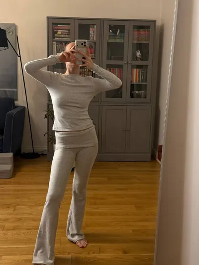 Я здесь редко делюсь одеждой, но этот костюм хочу отметить. Честно говоря, заказывала его, потому что он показался мне очень симпатичным. На деле он идеален для вечерних практик: мягкий, уютный, обво