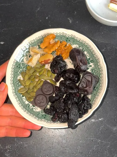 Когда я писала про ежедневные вкусные витамины, я не шутила. Мой набор для закрытия базовых микронутриентов выглядит так: •20 г изюма •2 финика •3 чернослива •2 дольки грецкого ореха •1 бразильский о
