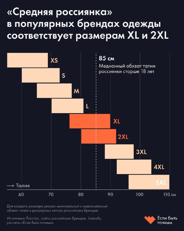 ▫️▫️▫️▫️▫️ Средняя талия россиянки у популярных брендов соответствует размеру XL Медианный обхват талии россиянки старше 18 лет — 85 см. Для 30 крупнейших российских брендов это размер XL или 2XL. То