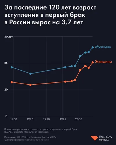 ▫️▫️▫️В каком возрасте россияне заключают брак Российские политики призывают россиян заключать браки как можно раньше. Но за последние 120 лет жители страны, напротив, стали жениться позже: если в 18