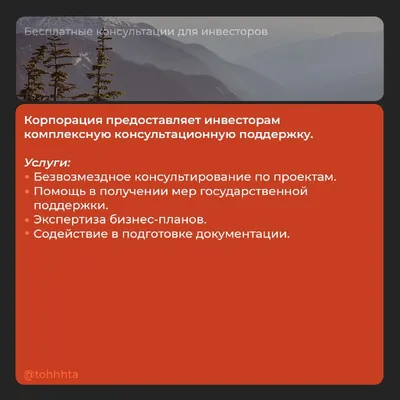 💰 Планируете инвестировать в КЧР? #тохтановись, ведь Вам помогут - причем бесплатно! Корпорация развития республики предлагает комплексную поддержку инвесторам - от идеи до реализации. Чем помогу