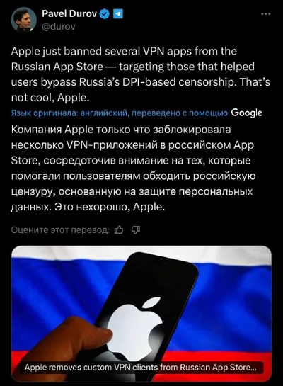 Дуров высказался в Твиттере по поводу удаления VPN-приложений в российском App Store: Компания Apple только что заблокировала несколько VPN-приложений в российском Арр Store, сосредоточив внимание на