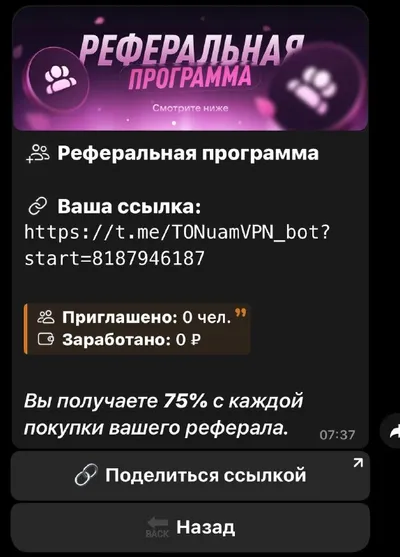 75% РЕФЕРАЛКА в @TONuamVPN_bot Подумайте несколько раз что с этим можно сделать. Один человек уже сообразил на рефералке @StarsByTONuam_bot. Теперь каждые выходные с девушкой летает в диснейленд пр