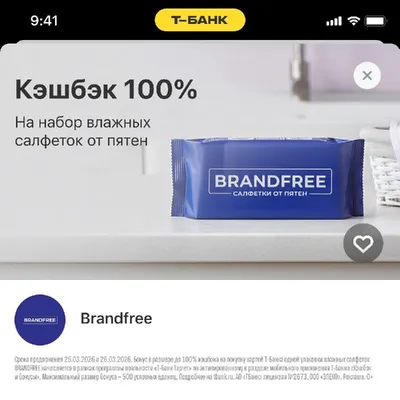 Оказывается, в Т-Банке, в разделе «Кэшбэк и бонусы», есть «Кэшбэк дня», в котором каждый день появляются новые выгодные предложения. Сейчас можно забрать 100% кэшбэк за набор влажных салфеток BRANDFR