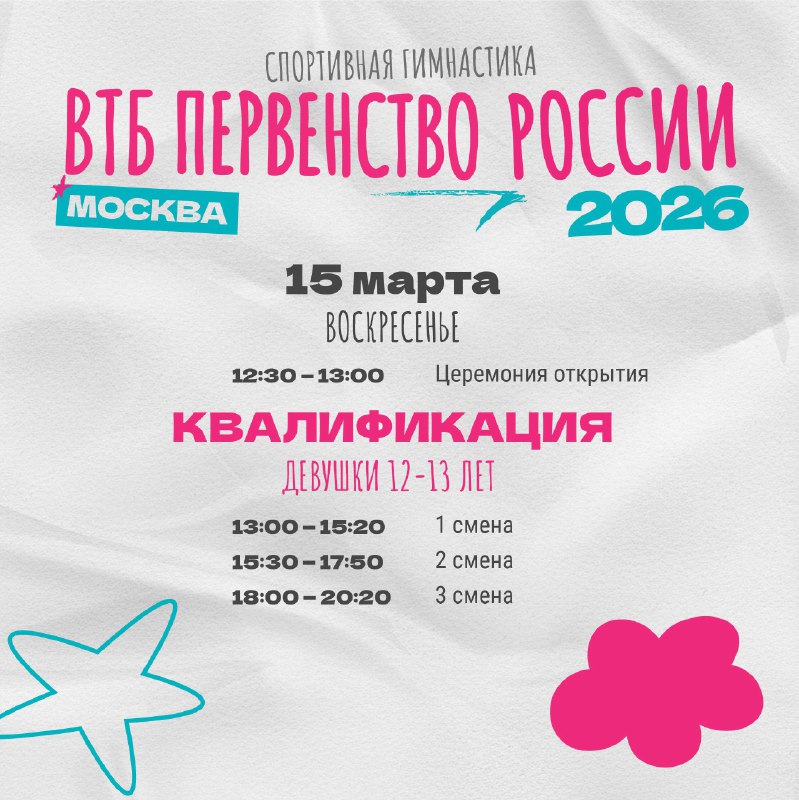 🌸 А вот и расписание ВТБ Первенства России 2026 по спортивной гимнастике в Москве среди девушек и юниорок Они выступят в Академии спорта «Динамо» 15-18 марта. 📹 Трансляции в нашей группе ВКонтакте