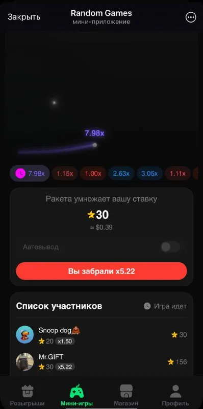 🚀 НОВЫЙ РЕЖИМ РАКЕТКИ В RANDOMGAMES Режим только вышел — х5–х10 ловятся довольно часто У меня примерно каждые 4–5 запусков 👉 Попробовать RandomGames🎁 ➖➖➖➖➖➖➖➖➖➖ 🤑 Лудка 24/7 🎰 Starsgram ⭐️ TOR