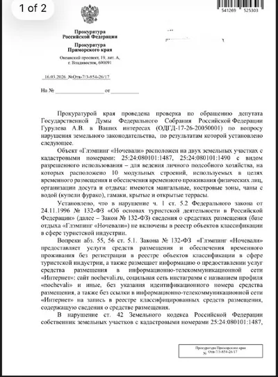 Насчет глэмпинга «Ночевали», из-за которого в Штыково тонет целая улица Ключевая. Прокуратура края провела проверку по обращению депутата Государственной Думы Гурулева, к нему обращались жители. Объ