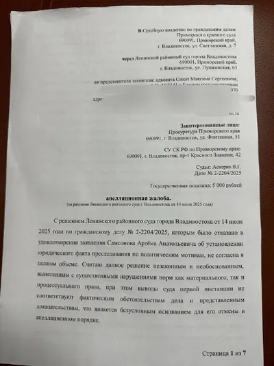 С минуты на минуту в Приморском краевом суде (Мордовцева, 12) начнется заседание по делу об установлении юридического факта политического преследования. Апелляционная инстанция. 🆗Апелляционную жалоб