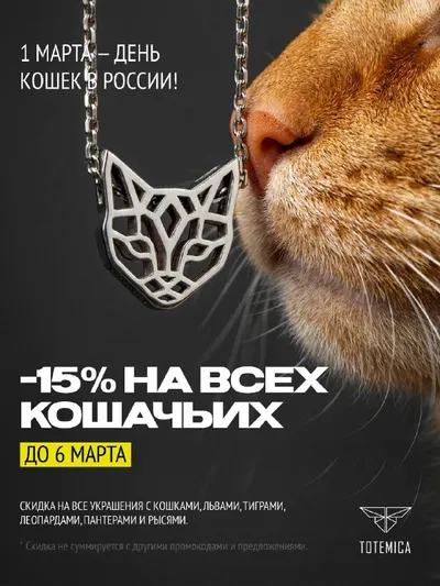 🐾 Замуууурчательная неделя в TOTEMICA! 🐾 1 марта — день кошек в России, и мы не могли пройти мимо такого пушистого повода. В честь праздника дарим скидку 15% на ВСЕ украшения с кошачьими — до 6 ма