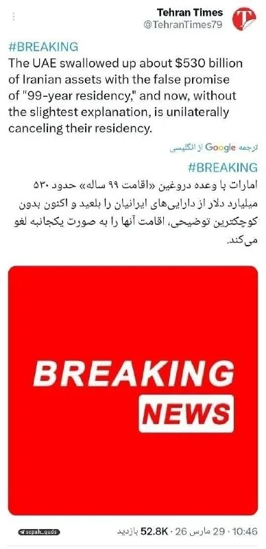 🇦🇪 🇮🇷 ОАЭ аннулировали ВНЖ всем гражданам Ирана, включая «золотые», сообщает иранское агентство Tasnim, утверждая, что решение принято в одностороннем порядке и без объяснения причин. По данным и