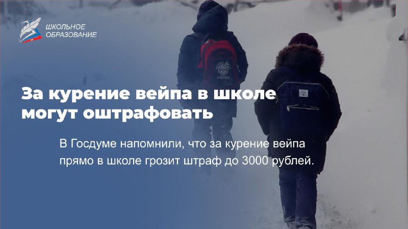 За курение вейпа в школе могут оштрафовать В Госдуме напомнили, что за курение вейпа прямо в школе грозит штраф до 3000 рублей. ❕ Кроме того, школьника поставят на учёт в ПДН. Родителей же могут ош