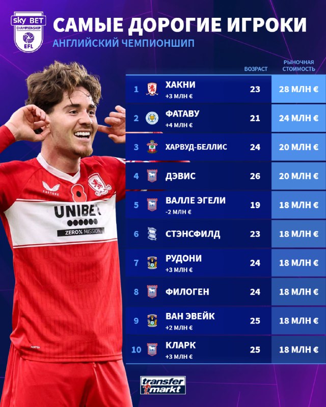 🏴 Редакция Transfermarkt обновила рыночные стоимости в английском Чемпионшипе 📊 Знакомим Вас с топами самых дорогих игроков и клубов лиги. Со всеми изменениями Вы можете ознакомиться н
