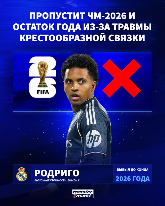 ❌«Реал Мадрид» объявил, что Родриго получил разрыв передней крестообразной связки и разрыв наружного мениска правой ноги и выбыл из строя до конца 2026 года. Бразилец пропустит Чемпионат мира 2026 го