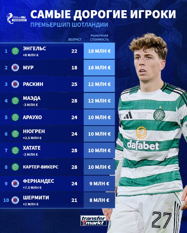 🏴 Редакция Transfermarkt провела промежуточное обновление рыночных стоимостей в Премьершипе Шотландии 📊 Представляем топ самых дорогих игроков и клубов чемпионата 💶 Со всеми изменения