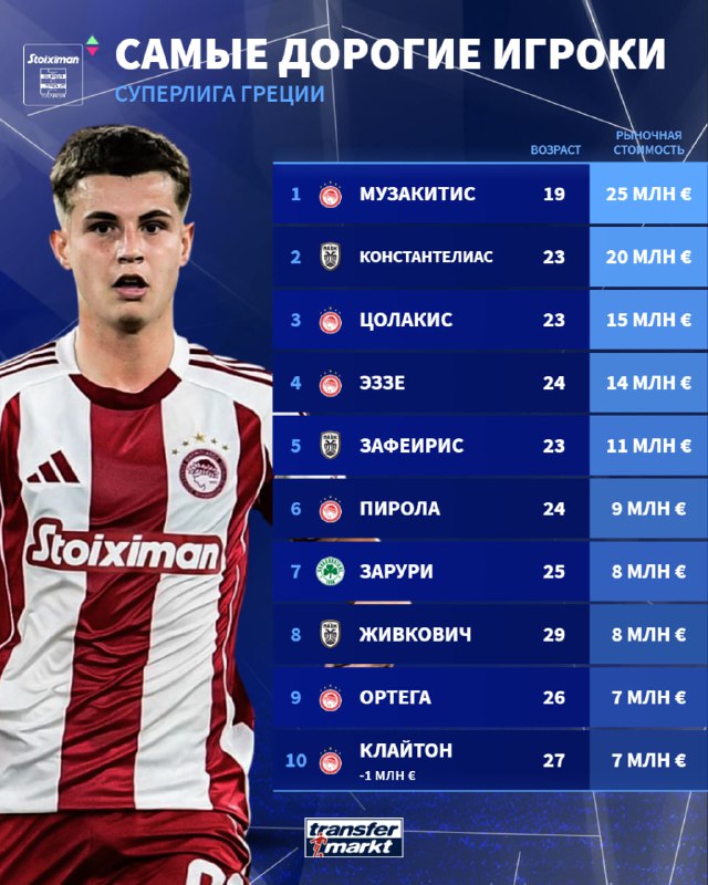 🇬🇷 Редакция Transfermarkt провела промежуточное обновление в Суперлиге Греции 📊 Представляем самых дорогих игроков чемпионата и топ игроков из стран постсоветского пространства. Все изменения на