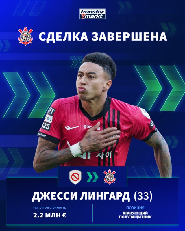 🇧🇷 Официально: Джесси Лингард стал игроком «Коринтианса» ✍🏻 Профиль игрока: https://transfermarkt.world/s/w6j